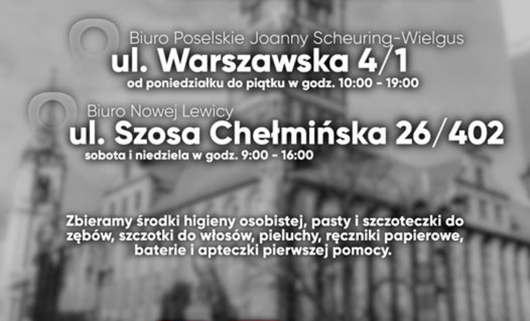 Rada Powiatowa Nowej Lewicy w Toruniu uruchomiła punkty zbiórek produktów na rzecz osób uciekających z Ukrainy przed działaniami zbrojnymi. Do siedzib biur - Rady Powiatowej Nowej Lewicy w Toruniu oraz poselskim Joanny Scheuring-Wielgus można przekazywać: